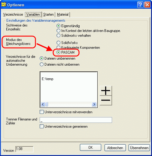 The PASCAM equation solver is activated at the PASCAM menu 'Options' by opening the 'Variables' tab: