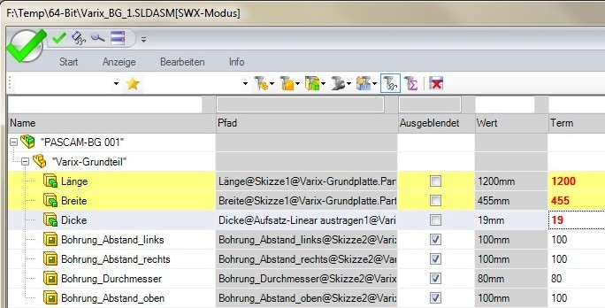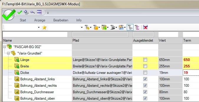 VariXPASCAM enables you to assign the final dimensions of individual parts and components as late as they are inserted in the assembled state. This enables the user to design a default part once and then derive quickly and safely dimensional variants of this part for subsequent application and further use in other assemblies. Of course therefore your effort for product model configuration is highly reduced whereas at the same time the flexibility for different applications of your fully parameterized default parts is increased remarkably.