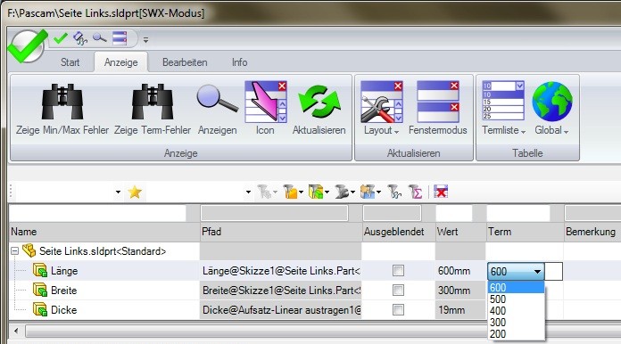 Based on the fully customer-defined termlist the user can e.g. apply certain standard modular or grid dimensions on the outside length dimension of a cabinet model very quickly from a listbox, which in turn will affect all associated, relevant sub-assemblies and components of the overall assembly.