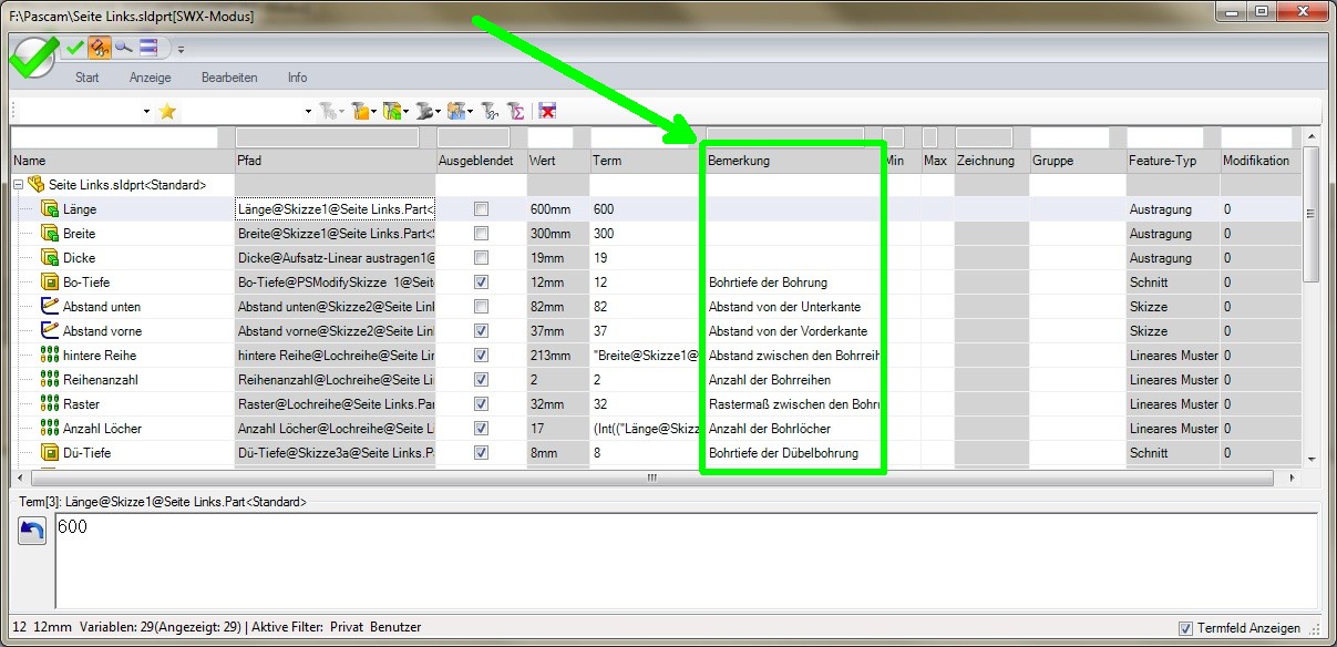 To get a more detailed documentation on your SOLIDWORKS® model, remarks and additional information can be entered at the "Remark" box of the Variable managment table. These remarks can be saved to every dimension as a short text and can be used to describe the meaning of the dimension or the applied equation term.