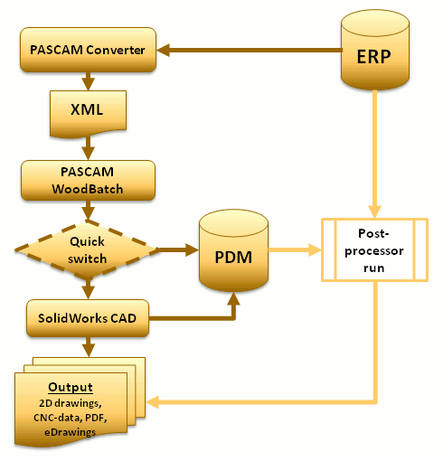 An example: If a design change occurs, due to a short-term customer request (e.g.: request for an alternative handle), the Quick switch recognizes automatically, if certain manufacturing steps have changed as well. If so, appropriate, proven machining data is automatically retrieved from your PDM database and applied at the generation of a new manufacturing model in SOLIDWORKS®. Since the SOLIDWORKS® model for the manufacturing is completely re-generated at this process, all the usual SOLIDWORKS® export and output options (2D drawings, CNC data, PDF files, eDrawings) are all up to date and fully available for this special manufacturing model.