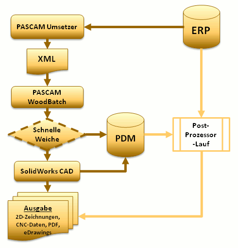 Die "Schnelle Weiche" ermöglicht das schnelle und sichere Ausführen von kurzfristigen Konstruktionsänderungen ihrer Fertigungs-Modelle auf SOLIDWORKS®-Ebene. Sie erkennt anhand von Merkmalsbeschreibungen, die von ihrem ERP-System geliefert werden, ob z.B. ein Möbelkorpus schon einmal konstruiert und gefertigt wurde und holt gegebenenfalls diese praxiserprobten Daten als bewährte Modell-Vorlage zur sicheren Wiederverwendung aus dem PDM-Archiv des Anwenders (z.B. aus einer Enterprise PDM-Datenbank).